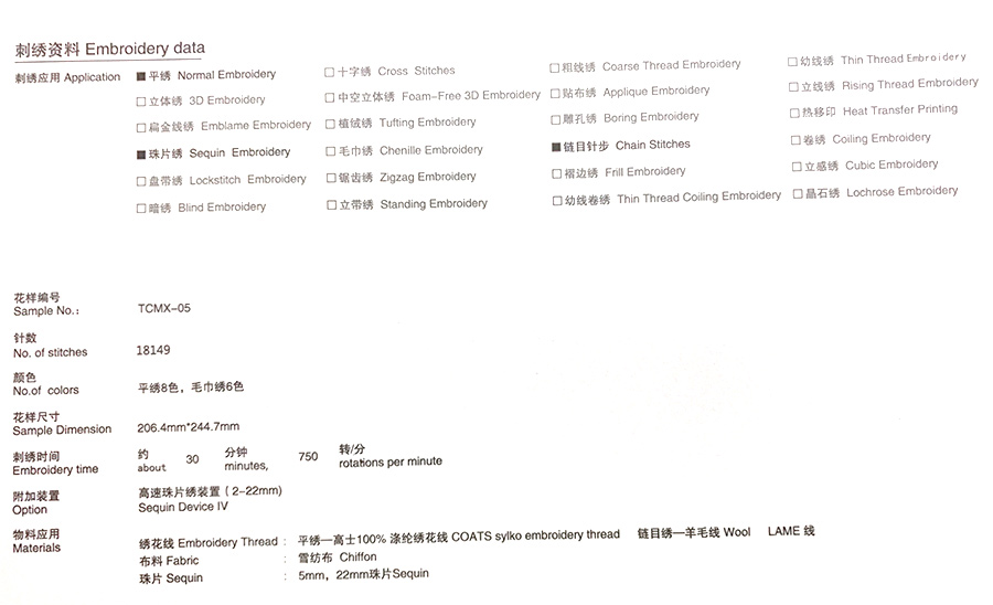 鏈目繡與珠片繡、平繡的完美結(jié)合,5mm及22mm大型珠片刺繡,鏈目繡中采用了3種特殊線材(淡雅的羊毛線、炫麗的LAME線、光彩奪目的金屬線) ,從而勾勒出五彩繽紛的花朵,豐富了設(shè)計(jì),提升了產(chǎn)品的附加值。