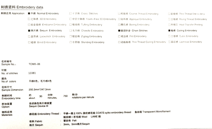 獨(dú)特的卷繡裝置,配合珠片繡、卷繡、鏈目繡創(chuàng)制出豐富多彩、高附加價(jià)值的刺繡產(chǎn)品。