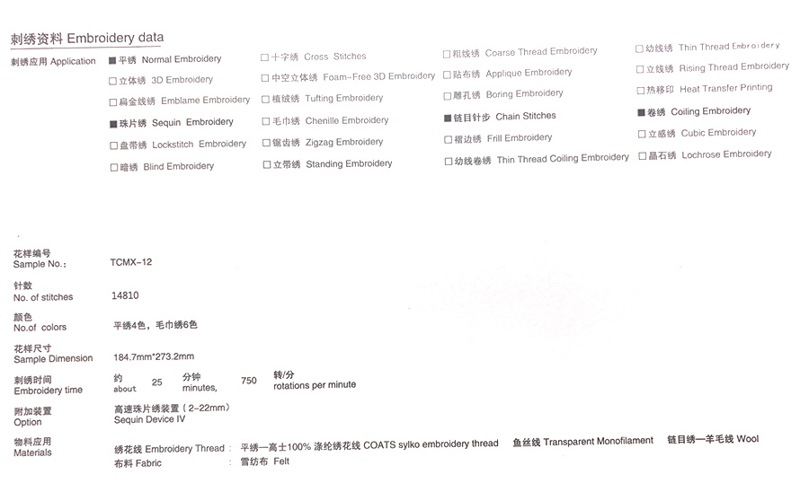 MT-1為出廠前選購件,裝置可進行卷繡和帶繡,可通過輕觸式張力控制,均勻地將色線繞在線芯造成卷繡,結合鏈目繡及毛巾繡可創(chuàng)制出更多新穎的刺繡樣品。附圖采用了卷繡作包邊效果,卷繡的包線采用了LAME線,故效果閃亮。